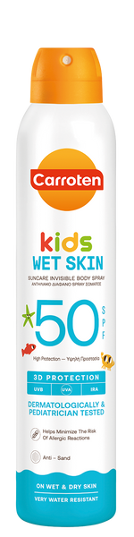 Revolutionerende solcreme på spray til børn, som ikke skal smøres ud, og som både kan påføres VÅD og TØR hud! Uundværlig til sommerferien, og mindsker risikoen for konflikter med solcreme-påføring.